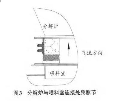 (3) 分解爐與喂料室連接處膨脹節(jié) 。 分解爐與喂料室連接處膨脹節(jié)見圖 3 。此處比較特殊,也是容易出現(xiàn)問題的地方。通常理解為,此處連接喂料室與分解爐,來自喂料室的高速氣流通過膨脹節(jié)進入上部分解爐,對膨脹節(jié)使用影響的是氣流,膨脹節(jié)應(yīng)該與圖 2 安裝方向相同。