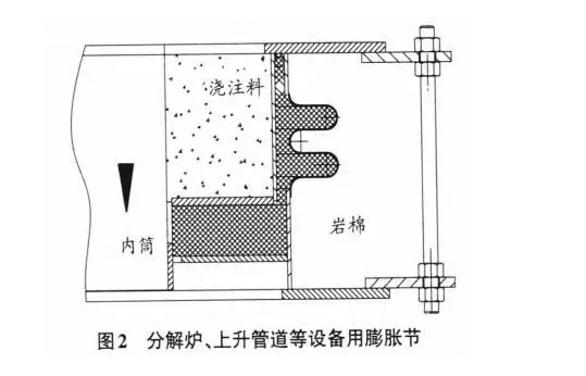 。由于料管上有起到通斷作用的鎖風閥,熱風被截斷,物料是管道的介質(zhì)。因此,只要_膨脹節(jié)按照物料流動方向安裝,內(nèi)部巖棉會受到很好的保護,膨脹節(jié)很少失效。除此之外,還要注意內(nèi)筒下部跟澆注料之間的間隙控制,間隙太小會影響內(nèi)筒移動,引起膨脹節(jié)失效。間隙太大,對巖棉保護不利。