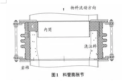 該膨脹節(jié)正處于分解爐底部,來自料管的物料正撒入其上部不遠處,因此,時刻有大量物料沒有隨著氣流帶走,而是直接通過膨脹節(jié)進入喂料室,也_是塌料。塌下的物料很容易填滿巖棉空間,導致膨脹節(jié)失效。因此,該處的膨脹節(jié)安裝應(yīng)該按照料流方向。