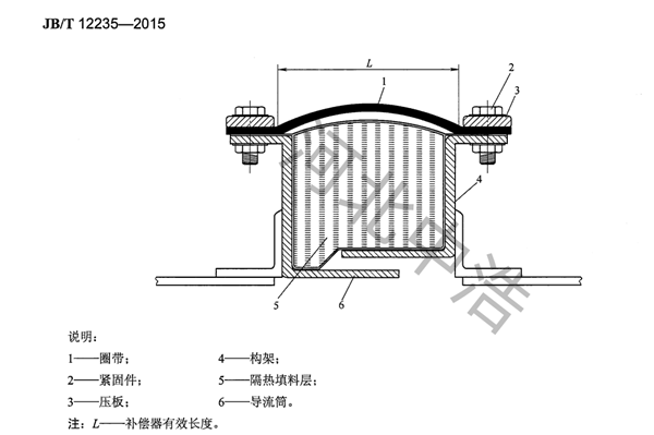 d---------壓板,壓板采用不銹鋼壓板,將圈帶與螺栓緊密連接 ,使其無泄漏 e----------------導(dǎo)流筒,采用加厚不銹鋼,降低直接磨損,增強(qiáng)疲勞次數(shù) f-------------隔熱填料層,加入陶瓷纖維、硅酸鋁和巖棉等,對非金屬補(bǔ)償器起到隔熱作用,降低熱傳遞和適當(dāng)防塵效果。