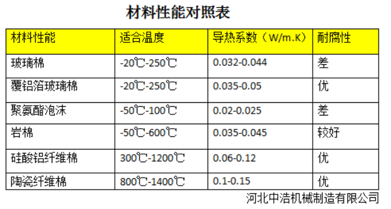 明確溫度范圍,一般分為低溫(-50 ℃-常溫)常見冷庫管道和液化天氣管系等,注意防止結露。中溫管道(常溫-300 ℃,常見如蒸汽或熱水系統(tǒng),而高溫(300 ℃-1200 ℃),如鍋爐煙氣或高溫反應器管道。還需考慮介質(zhì)特性,如是否屬于腐蝕性氣體或酸堿介質(zhì),流體流速是否過大,如壓縮機出口流速較大。還需注意環(huán)境要求,如化工防爆區(qū)需要阻燃材料,防火等級要求高,如海洋環(huán)境或潮濕地下室需要防潮、防腐。具體可參照下面材料性能對照表選擇: